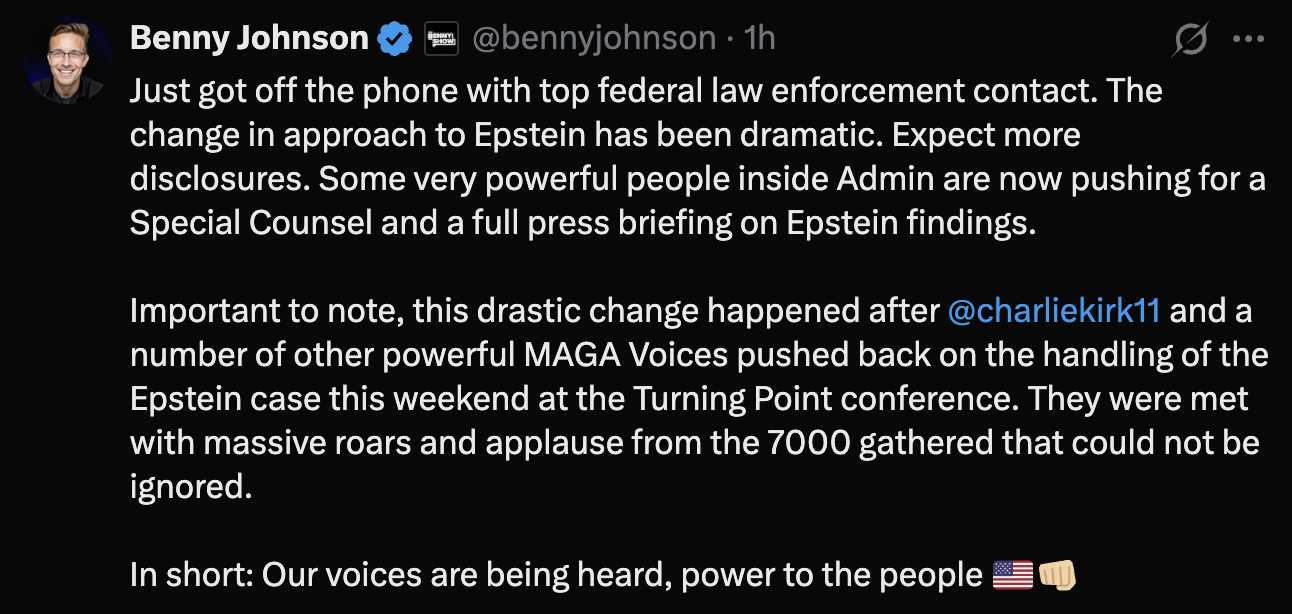 The Epstein saga is not over, it's now bigger than ever. https://truthsocial.com/@X22Report/114854015982348767