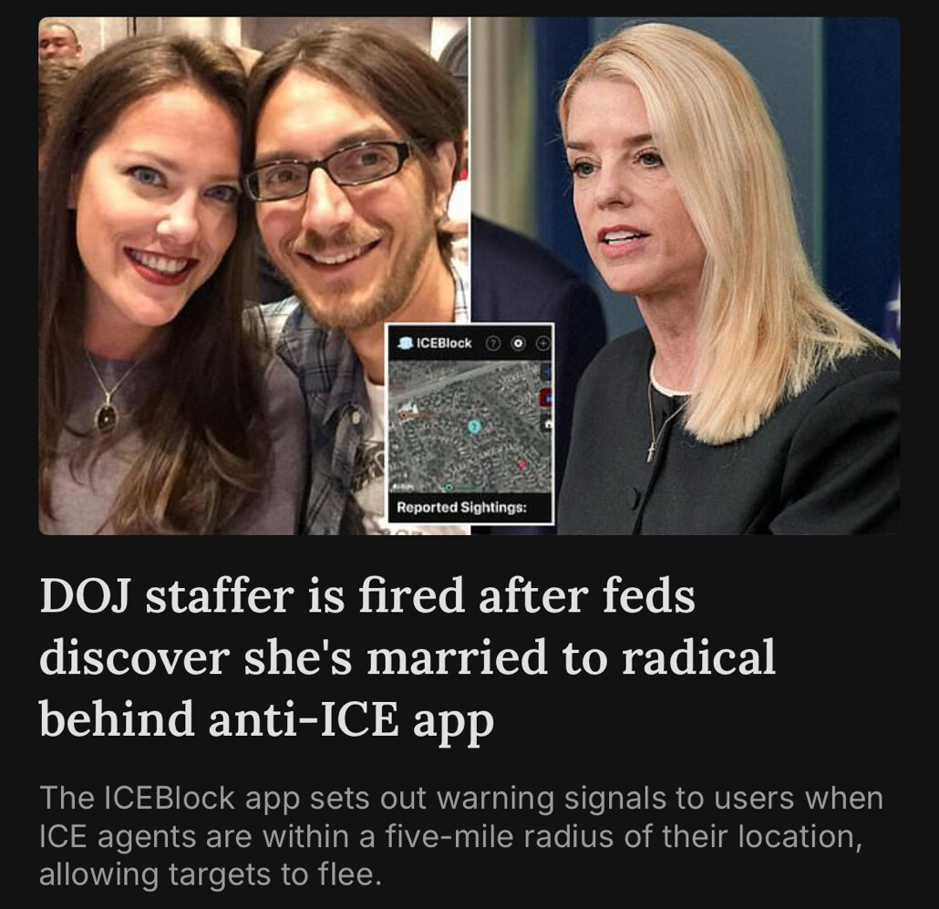 A DOJ staffer married to the radical behind an anti-ICE app — disgraceful and dangerous. These people are everywhere, embedded in government, and we need to find them and root them out. No one connected to anti-law enforcement agendas should have any power. Taxpayers deserve better. https://truthsocial.com/@Qanon76/114895804048409874