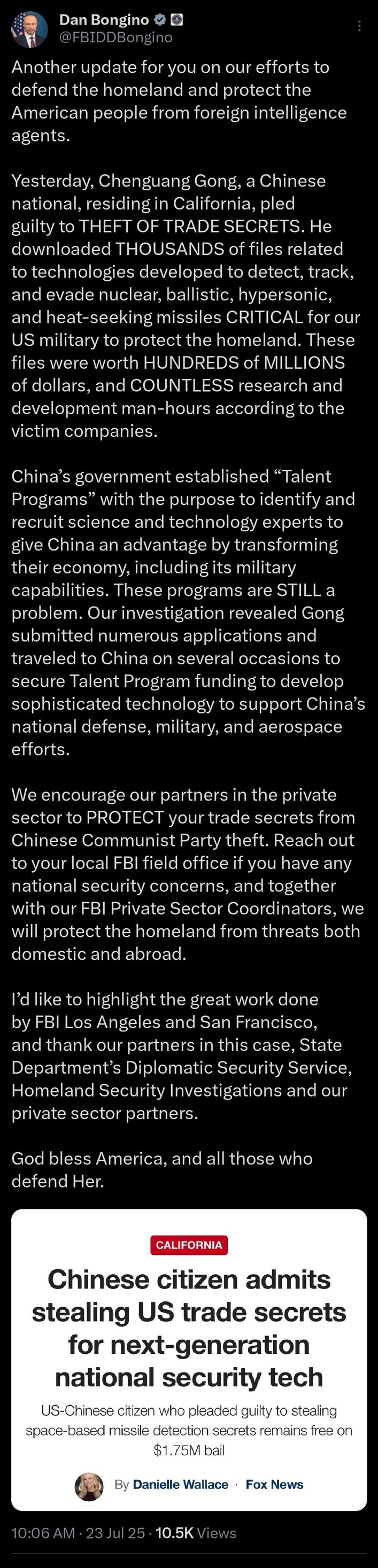 Yesterday, Chenguang Gong, a Chinese national, residing in California, pled guilty to THEFT OF TRADE SECRETS. He downloaded THOUSANDS of files related to technologies developed to detect, track, and evade nuclear, ballistic, hypersonic, and heat-seeking missiles CRITICAL for our US military to protect the homeland. These files were worth HUNDREDS of MILLIONS of dollars, and COUNTLESS research and development man-hours according to the victim companies. https://truthsocial.com/@PepeDeluxe/114902984135970025