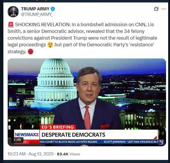 NEW --> ...admission on CNN...the 34 felony convictions against President Trump were not the result of legitimate legal proceedings but part of the Democratic Party's 'resistance' strategy. https://truthsocial.com/@perfectsliders/115022595935512912