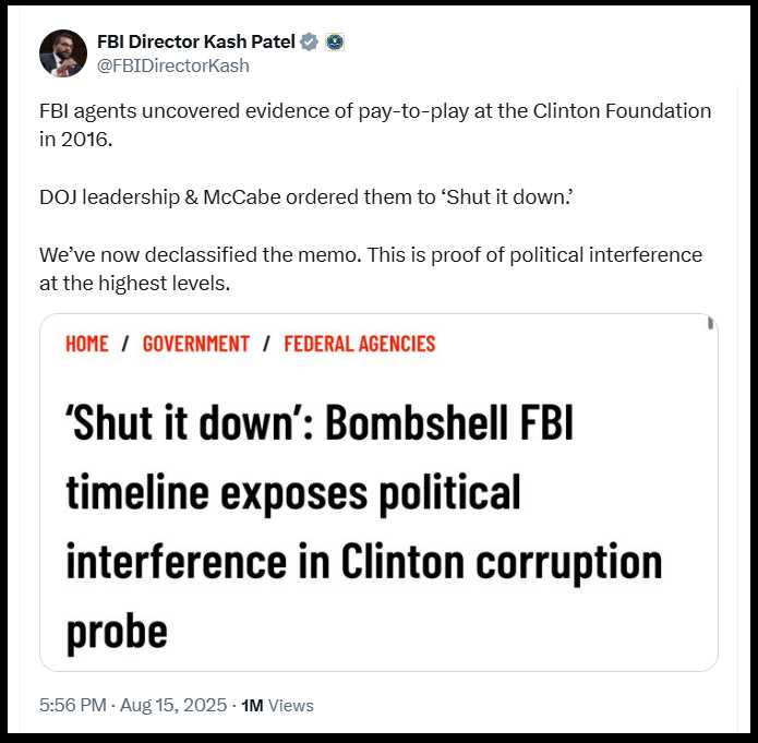 https://x.com/FBIDirectorKash/status/1956520402613665888 https://truthsocial.com/@ILoveAmericaNews/115038992664091148