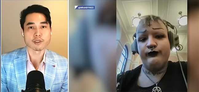 🔥 The crazy "trans" on the right is Phillip Haski Delisi, who calls himself Isabell. The one on the left is Andy Ngo, a great reporter and author who lives in Portland. "Isabell" is a part of Antifa and wears a huge mask and a black T-shirt with an "Antifa's super soldier" tag. Since Andy Ngo has written and reported about him for years, he is now chasing him and threatening to kill him. 😡
