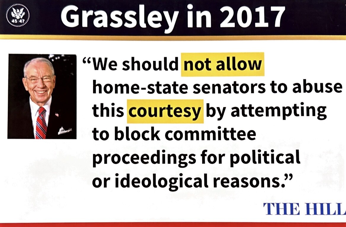 RT: https://truthsocial.com/users/realDonaldTrump/statuses/115075265001658383 Instead of blaming President Trump’s most effective ally in the Senate (Grassley) for the century-old blue-slip scam, let’s do this: