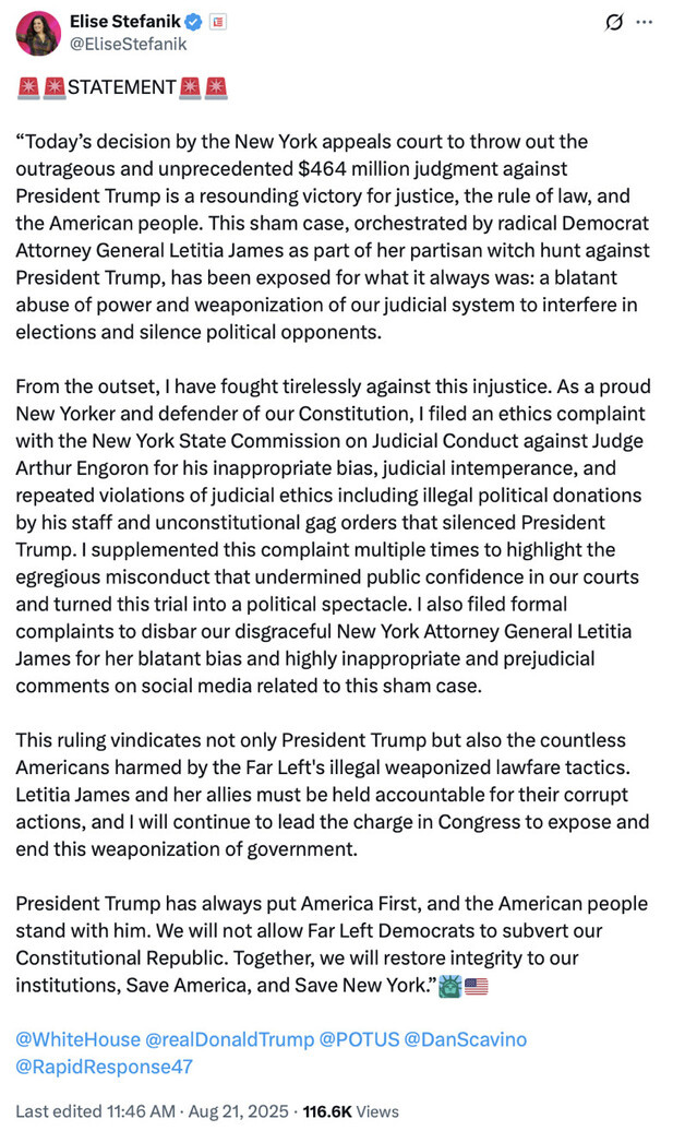 Thank you to Elise Stefanik, a Great Warrior! https://truthsocial.com/@realDonaldTrump/115124041395193539