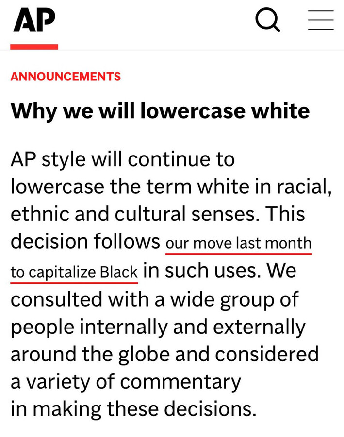“AP’s style guidelines literally says to lowercase White and capitalize Black