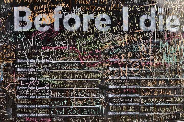 Inside the museum, there was a room where you could write wishes on the walls with chalk, as part of an interactive art exhibit. It’s a re-creation of the “before I die” board they put up at Burning Man, where people list things they want to do before they die.