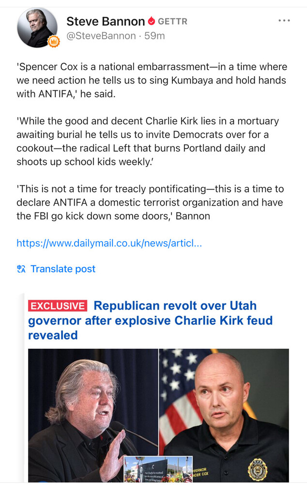 https://www.dailymail.co.uk/news/article-15093527/spencer-cox-steve-bannon-charlie-kirk-assassin.html https://truthsocial.com/@SteveBannonsWarRoom/115194841572645224