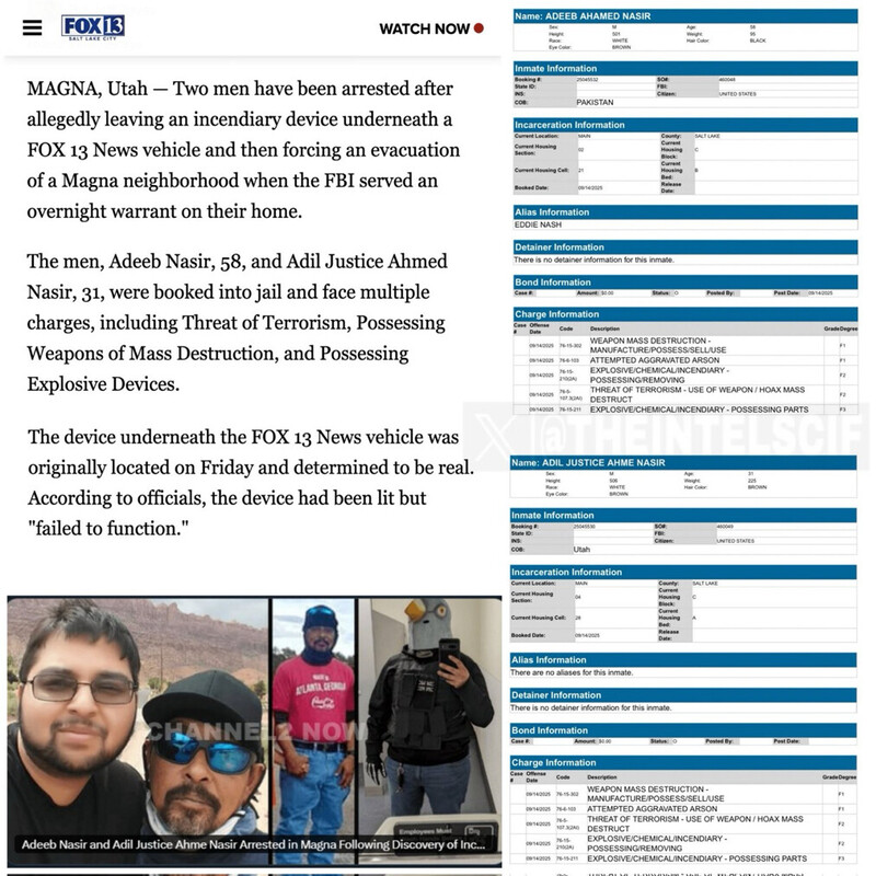 The FBI arrests two men in Utah for attempting to blow up a news vehicle at a vigil for Charlie Kirk with an incendiary explosive.