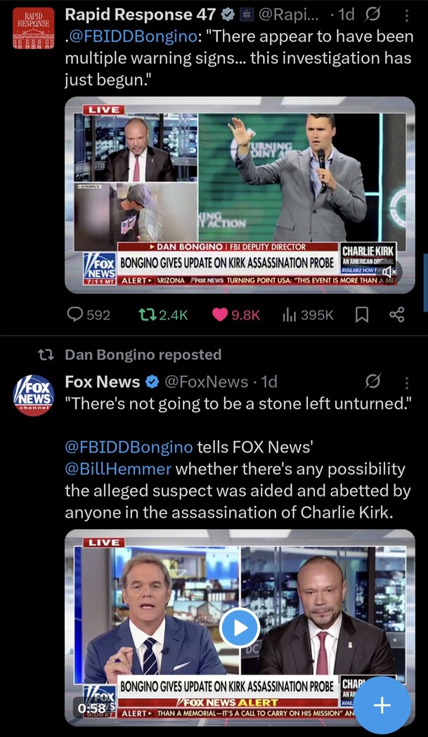 Dan Bongino says FBI sees wider network behind Kirk killing https://truthsocial.com/@PepeDeluxe/115214359986178300