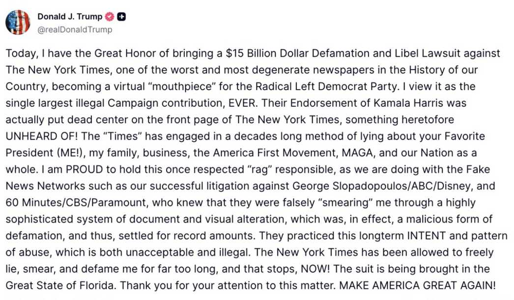 Trump is filing a $15 Billion Dollar Defamation and Libel Lawsuit against The New York Times.