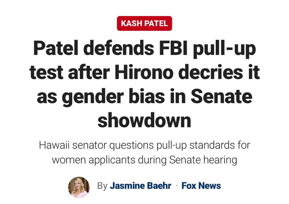 https://www.foxnews.com/politics/patel-defends-fbi-pull-up-test-hirono-decries-gender-bias-senate-showdown https://truthsocial.com/@ericaknight/115216713382191805