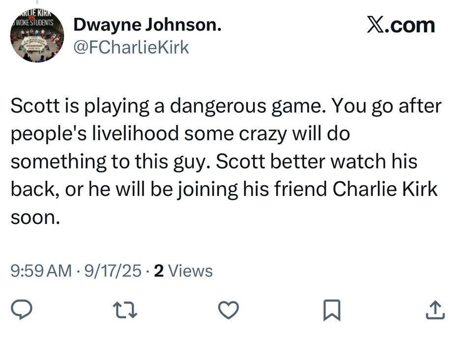 “Scott better watch his back, or he will be joining his friend Charlie Kirk soon.” https://truthsocial.com/@ScottPresler/115220126558411131