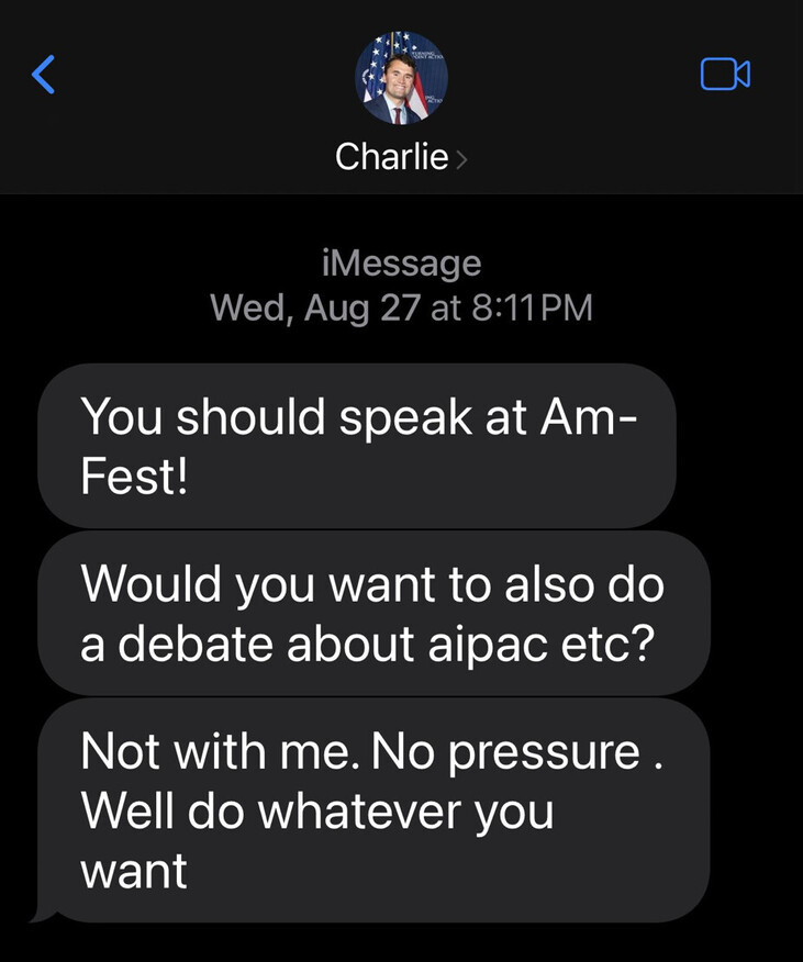 If you don’t know who to believe, between Bibi Netanyahu (a foreign country’s leader) or Charlie’s personal friends Candace Owens and Tucker Carlson, I’m posting my last text message with Charlie.