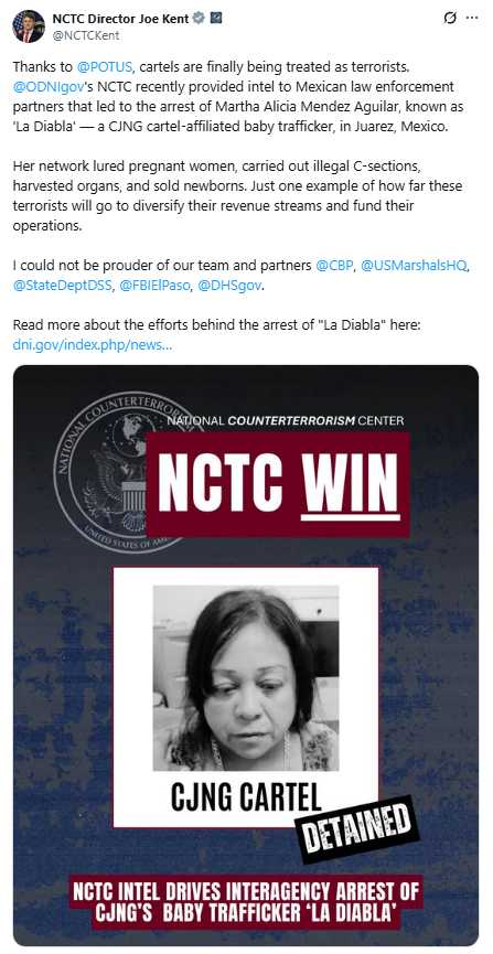 Exceptional work by our team at ODNI's National Counterterrorism Center who are working hard every day with our US interagency partners, law enforcement, and Mexican law enforcement to defeat cartels and keep the American people safe, secure and free. Great job, NCTC! https://truthsocial.com/@DNITulsiGabbard/115266183998057934