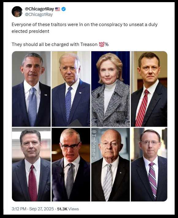 I agree. There is enough publicly available information to indict all of these people for treason. https://x.com/Chicago1Ray/status/1972061724095533256 https://truthsocial.com/@ILoveAmericaNews/115282521490650221