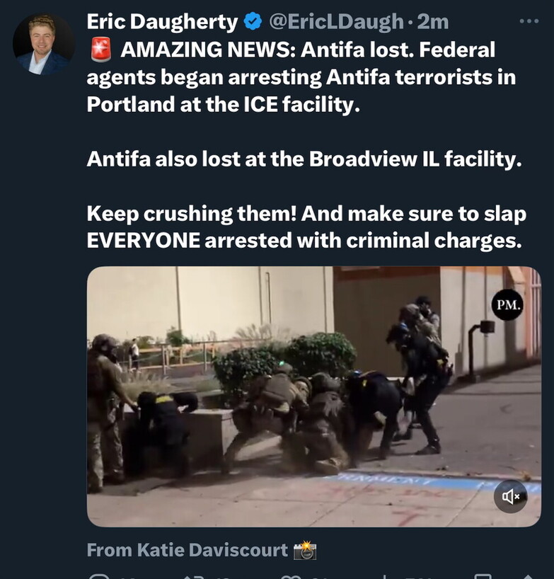 Antifa lost in Portland. Federal agents in Portland, Oregon, tackle Antifa terrorists to the ground and drag them into an ICE facility for arrest. 26 reported arrests. https://truthsocial.com/@AnnieLala17/115281684953768397