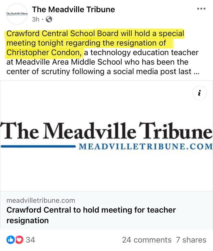 Chris Condon — a Meadville Area Middle School teacher who celebrated Charlie Kirk’s assassination — is resigning.