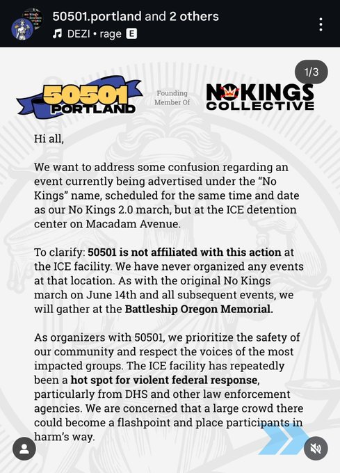 "No Kings" protest organizers in Portland have been forced to issue a statement after anarchists tried to co-opt the event on that day. 50501 organizers say they will not be meeting at the ICE facility after alternative flyers were distributed falsely claiming the official protest would be held there.