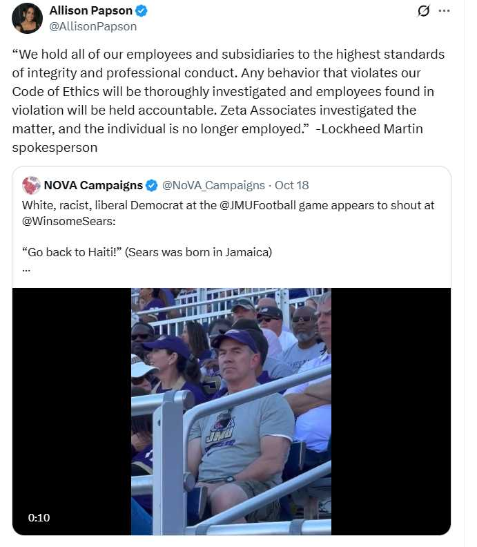 RT: https://truthsocial.com/users/CitizenFreePress/statuses/115402235468763408Racist Virginia Democrat has been terminated.