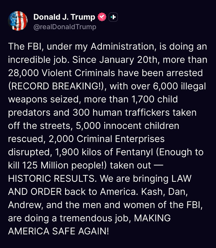 Trump praises his FBI for the job they have been doing stopping violent crime, human traffickers, child predators, etc.