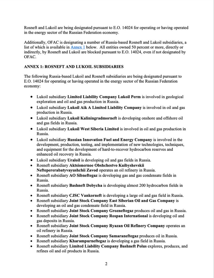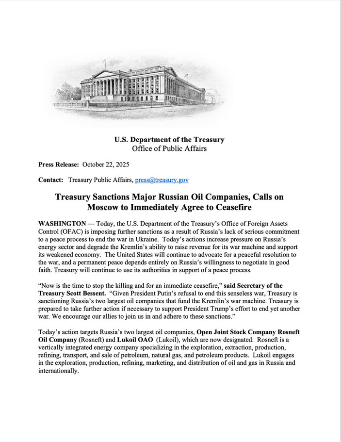 “Treasury Sanctions Major Russian Oil Companies, Calls on Moscow to Immediately Agree to Ceasefire” https://truthsocial.com/@realDonaldTrump/115419815673188246