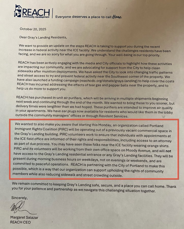 🚨Exclusive: A leftist anti-ICE group called Portland Immigrant Rights Coalition (PIRC) will be moving into a vacant office space at the bottom floor of Gray’s Landing — which is the apartment building directly across the street from the ICE facility.