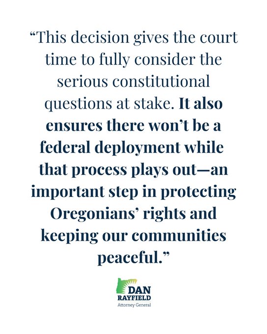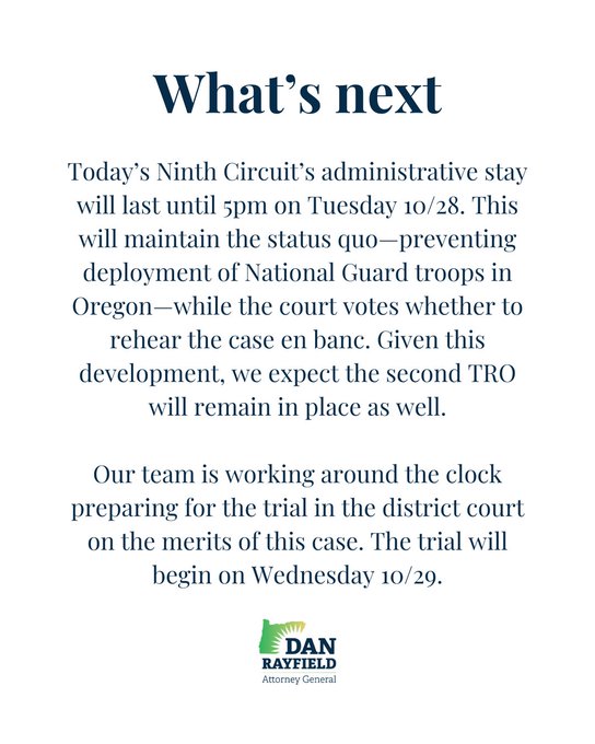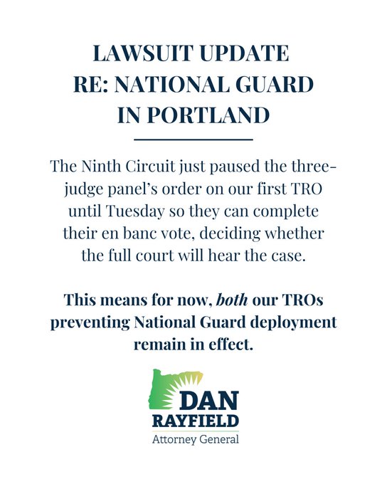 LAWSUIT UPDATE RE: NATIONAL GUARD IN PORTLAND: The Ninth Circuit just paused the three-judge panel’s order on our first TRO until Tuesday so they can complete their en banc vote.