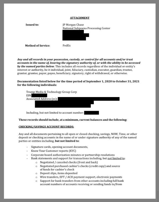 🚨🚨🚨🚨🚨🚨🚨🚨🚨🚨🚨🚨🚨🚨We discovered today from the Senate Judiciary Committee that Trump Media & Technology Group was among the more than 400 Trump-linked individuals and organizations that were spied on as part of Special Counsel Jack Smith's investigation of President Trump--specifically, the Smith team issued a shockingly broad, secret subpoena for our banking records. This is a stunning abuse of power against a private business and our hundreds of thousands of retail investors, especially since Trump Media did not even exist at the time of the events Jack Smith was supposedly investigating. We now need to know what the SEC and J.P. Morgan knew about this blatant malfeasance, when did they know it, and whether anyone leaked our bank records. https://truthsocial.com/@DevinNunes/115460265298566065