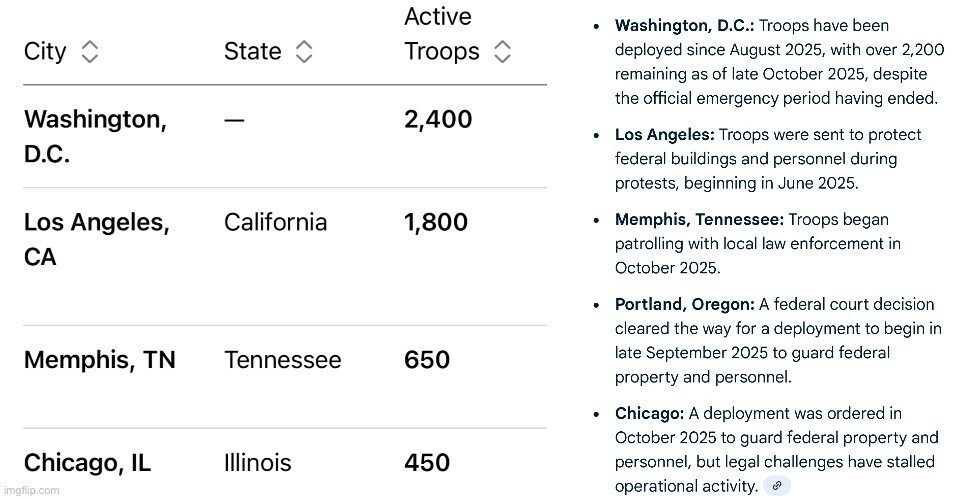 According to Grok and Chat GPT, there are thousands of troops in DC and LA, along with hundreds of troops in Memphis, Chicago, and Portland.