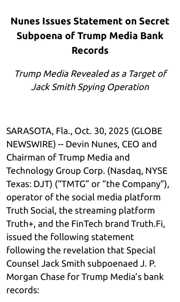 “We discovered today from the Senate Judiciary Committee that Trump Media & Technology Group was among the more than 400 Trump-linked individuals and organizations that were spied on as part of Special Counsel Jack Smith's investigation of President Trump--specifically, the Smith team issued a shockingly broad, secret subpoena for our banking records. This is a stunning abuse of power against a private business and our hundreds of thousands of retail investors, especially since Trump Media did not even exist at the time of the events Jack Smith was supposedly investigating. We now need to know what the SEC and J.P. Morgan knew about this blatant malfeasance, when did they know it, and whether anyone leaked our bank records.” 😳 https://truthsocial.com/@BeBraveWiseBold/115465125456096631