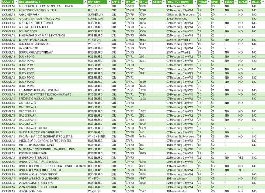 These REAL voter registration addresses in Douglas County Oregon don't actually list a REAL address. I guess the address is more of a suggestion.