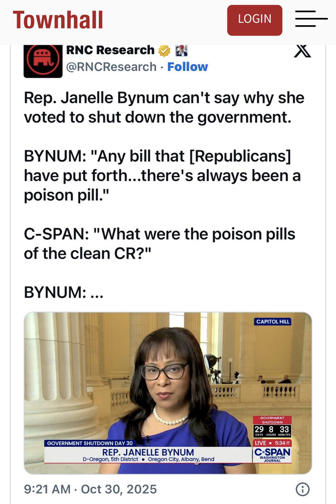 Oregon needs to do the change to red they have that democrat that’s a problem in fact many. They are just turning red vs blue. Good on Oregon https://townhall.com/tipsheet/amy-curtis/2025/10/30/janell-bynum-cr-poison-pill-n2665703
