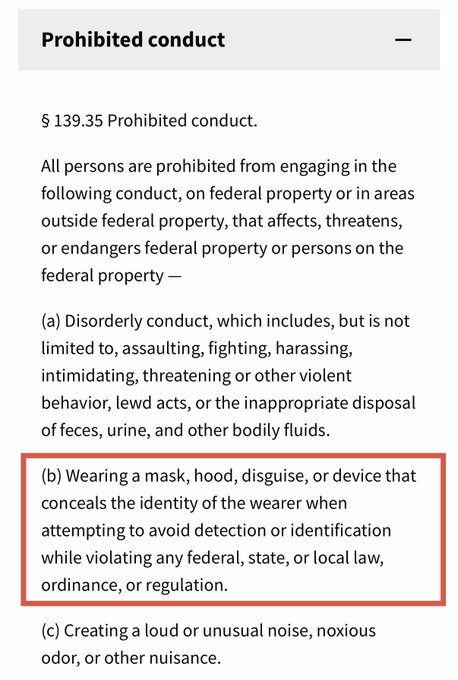 Wearing a mask on and/or near federal property is now prohibited, allowing federal agents to apprehend subjects on suspicion laws may be violated.