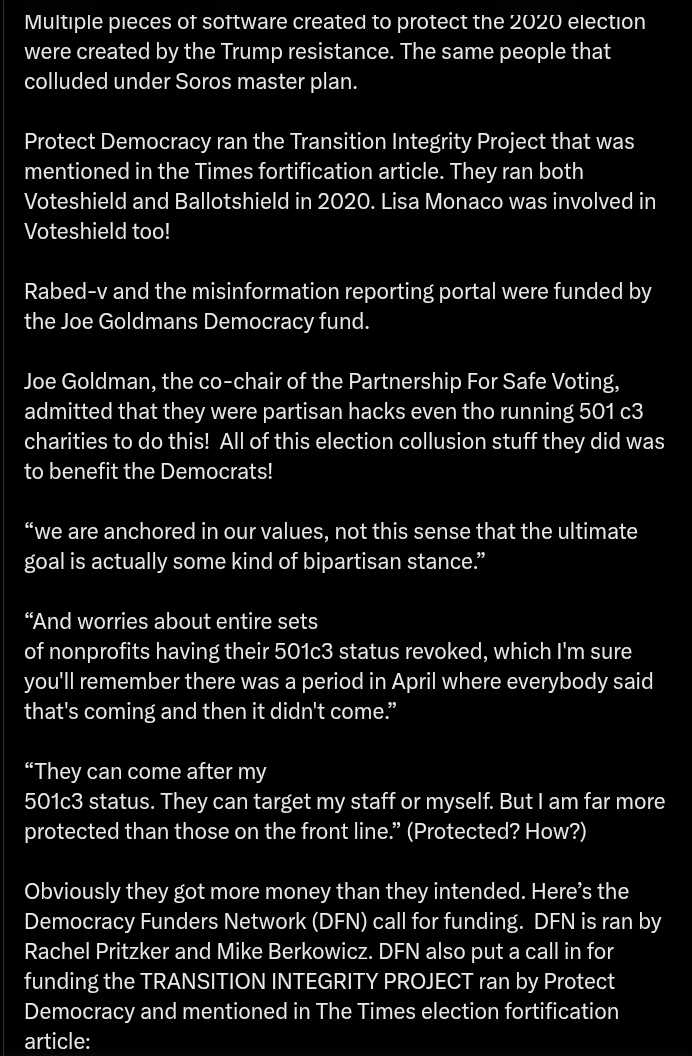 Joe Goldman, the co-chair of the Partnership For Safe Voting, admitted that they were partisan hacks even tho running 501 c3 charities to do this! All of this election collusion stuff they did was to benefit the Democrats!