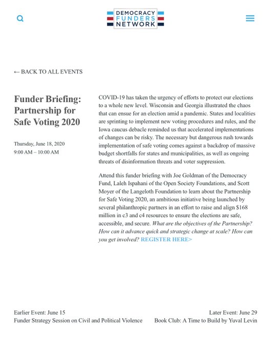 “Attend this funder briefing with Joe Goldman of the Democracy Fund, Laleh Ispahani of the Open Society Foundation, and Scott Moyer of the Langeloth Foundation to learn about the Partnership for Safe Voting 2020, an ambitious initiative being launched by several philanthropic partners in an effort to raise and align $168 million in c3 and c4 resources to ensure the elections are safe, accessible, and secure.”