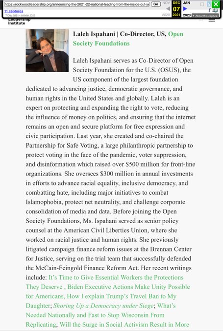Laleh Ispahani as Co-Director of Open Society-U.S. created the “Partnership for Safe Voting”. This ran under Neo Philanthropies State Infrastructure Fund plus other orgs. She was promoted to executive director of OSF after this.