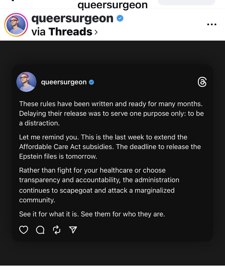 So Surgeon ‘Frankenstein’ Dr.Blair Peters aka queersurgeon in Portland Oregon thinks that protecting children from being mutilated by ppl like him has something to do with the Epstein info release tomorrow to distract away from that…😂😆 https://truthsocial.com/@AKLLL49/115743076080584330