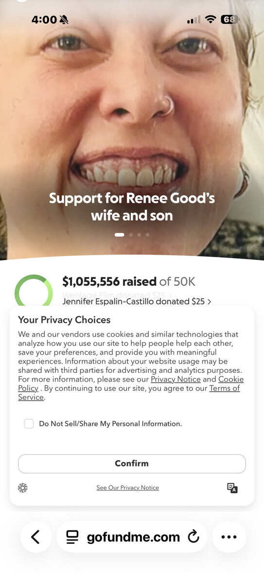 RT: Rene Good, the 37 year old who tried to run over the ICE agent, now has a GoFundMe to help her lesbian wife (why can’t she work?). If the $50k the originally sought, they have now, in less than $24 hours collect over $1M. One million $$$!!! And, instead of shutting it down now, they are still collecting more. Such love from her grieving wife, right?