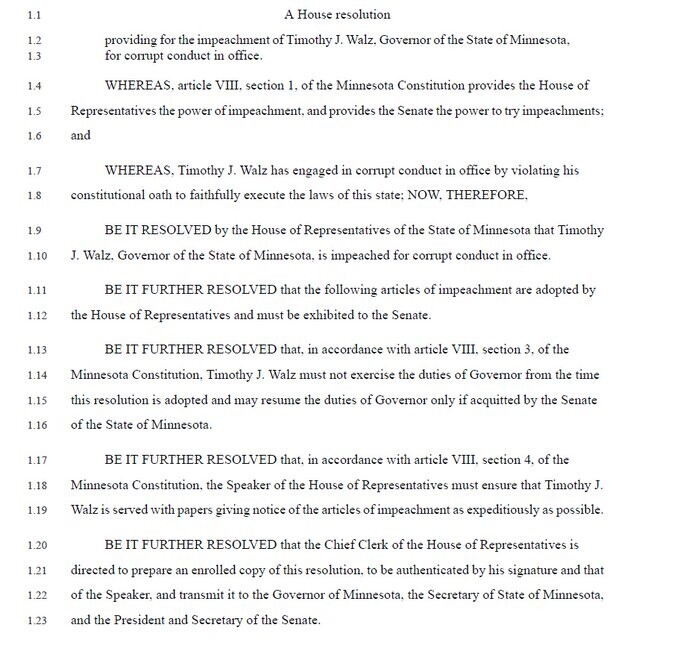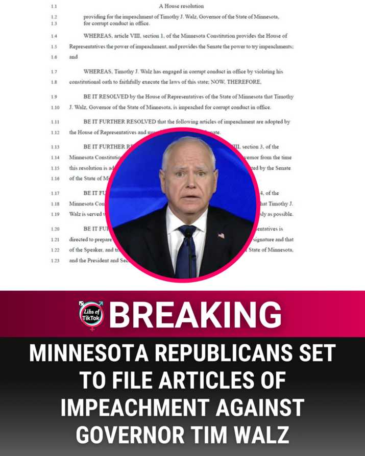 BREAKING: Minnesota Republicans set to file articles of impeachment against Governor Tim Walz, stating he "engaged in corrupt conduct in office by violating his constitutional oath to faithfully execute the laws of this state." https://truthsocial.com/@libsoftiktok/115895340545610057