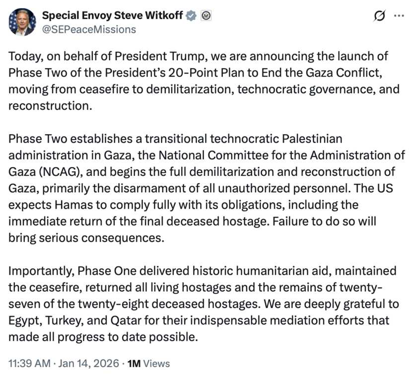 As Steve Witkoff announced, we have OFFICIALLY entered the next phase of Gaza’s 20-Point Peace Plan!