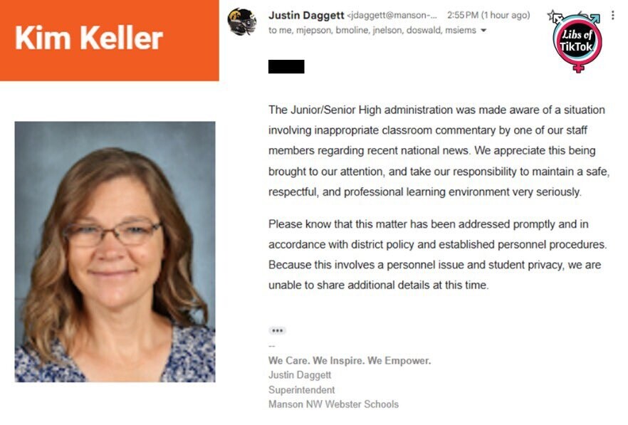 Manson Northwest Webster School District who SCREAMED and LIED to her class about the shooting of Renee Good is Kim Keller.