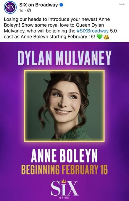 Dylan Mulvaney is playing one of King Henry VIII wives in a broadway musical.