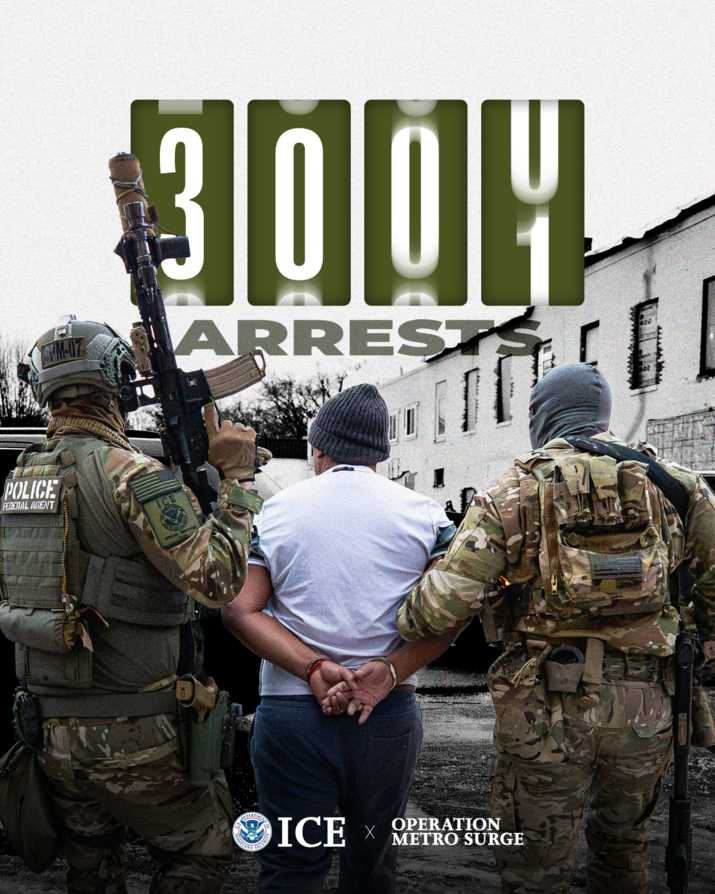 More than 3,000 arrests of criminal illegal aliens in Minneapolis' Operation Metro Surge since its inception.