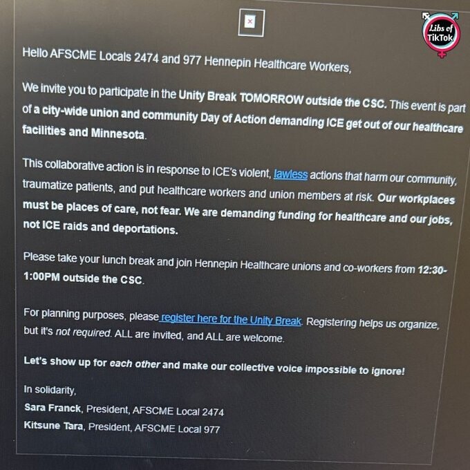 Hennepin Healthcare workers' unions in MN are sending messages to members, asking them to leave work and protest against ICE.
