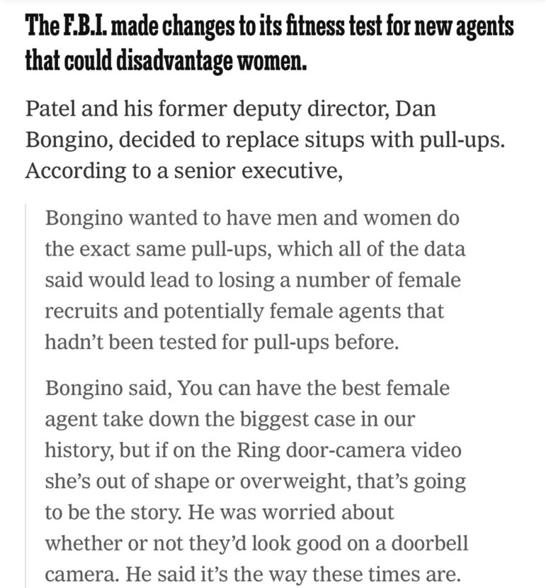 Kash and I absolutely made changes to the fitness requirements for agents. Agents work for you, the taxpayer, and they should be able to demonstrate the physical skills necessary to make an arrest.
