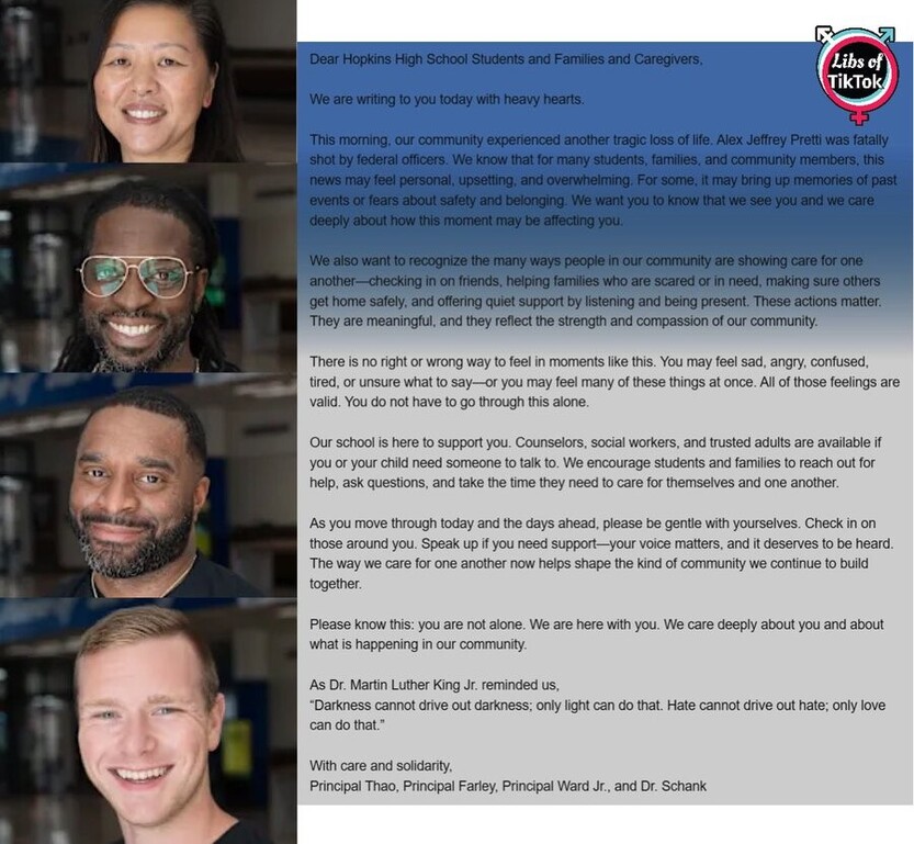 SCOOP: Hopkins High School in MN principals sent out an email to families crying with “heavy hearts” because an armed violent rioter was shot while trying to interfere with and harm federal agents.