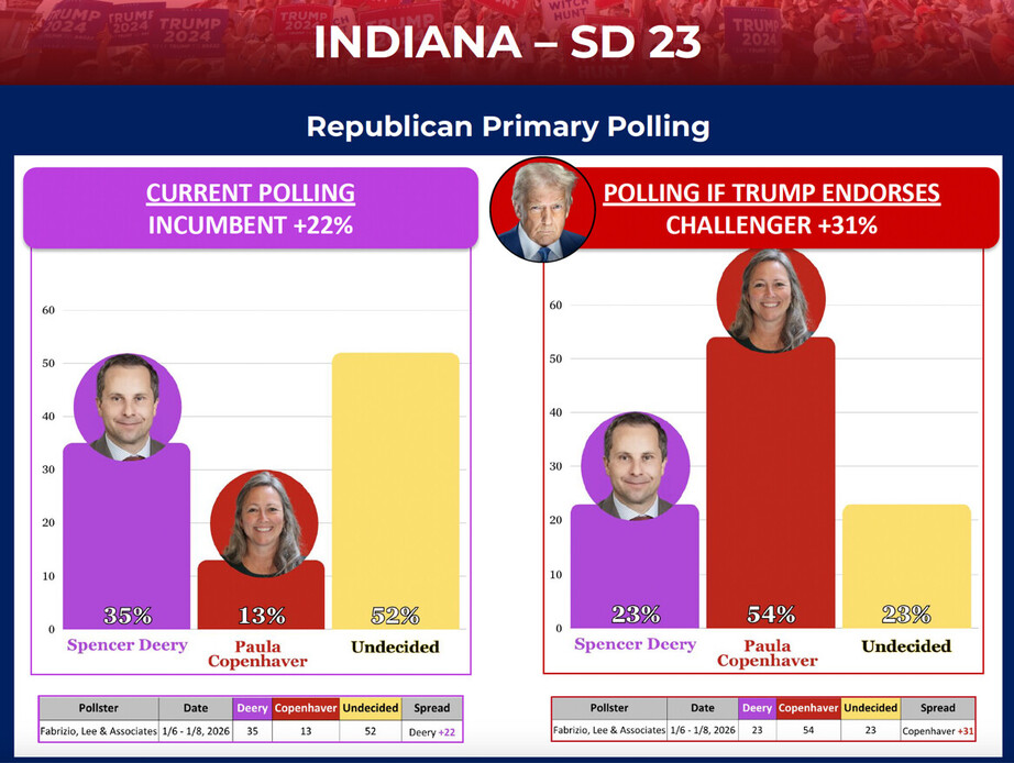 It is my Great Honor to endorse MAGA Warrior and Fountain County GOP Chair, Paula Copenhaver, a terrific Candidate for Indiana's 23rd State Senate District (which I won by 26 points!). Paula is running against an incompetent and ineffective RINO incumbent named Spencer Deery who, for whatever reason, betrayed his voters by voting against Redistricting in Indiana. Deery and his RINO friends made Indiana, a State I love and have been very good to, the only State in the Country that essentially said they don’t care if Democrats and Radical Liberal Judges keep conspiring to steal seats in the United States Congress from Republicans. We could have easily picked up two seats in Indiana, but Deery, an America Last politician, would rather side with Far Left Democrats who will do anything and everything in their power to reverse the incredible progress we have made for the American people over the last year since I reassumed the Office of President.