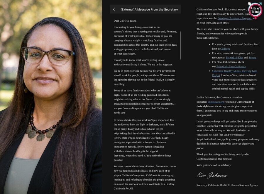 SCOOP: Kim Johnson, the Gavin Newsom-appointed Secretary for CA Health & Human Services, sent out a propaganda email to employees fearmongering about ICE and the Trump admin, promising to protect illegals, and providing resources to employees who "need support in these difficult times."