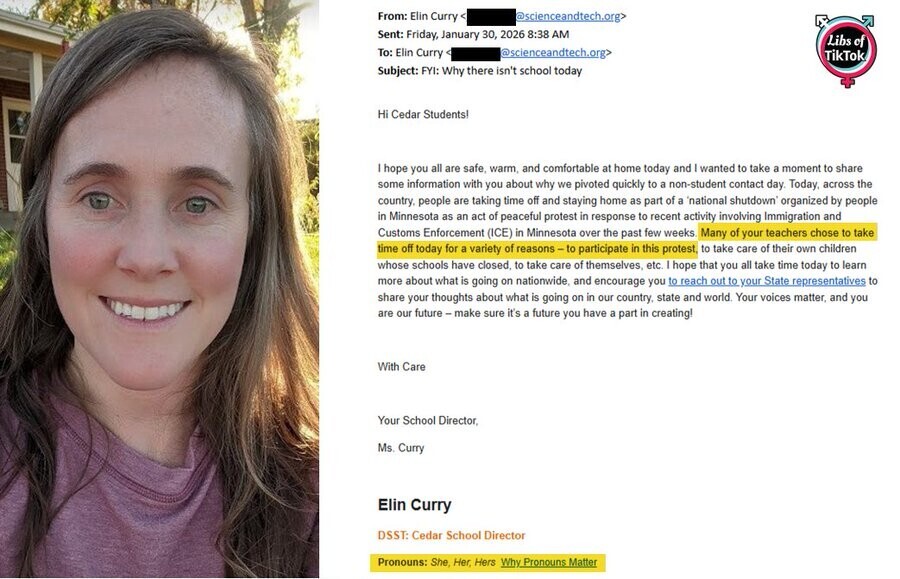 SCOOP: Elin Curry, the School Director for DSST Public Schools in Colorado who has pronouns in her bio, sent an email to students telling them that many of their teachers are not in school today because they are out protesting ICE.
