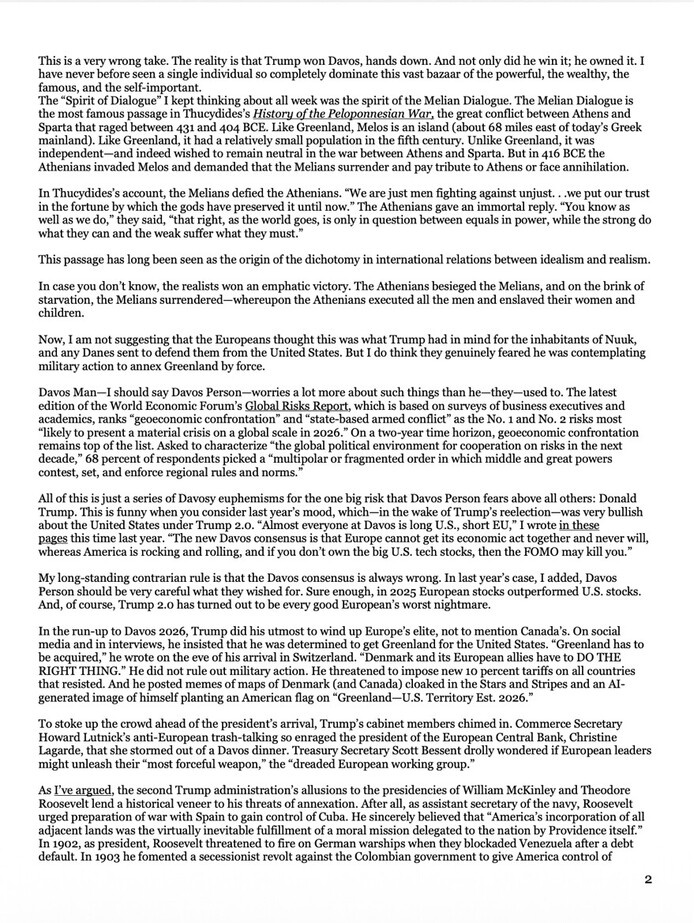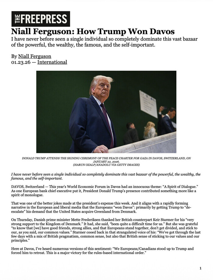 Niall Ferguson: How Trump Won Davos: https://www.thefp.com/p/niall-ferguson-how-trump-won-davos/ https://truthsocial.com/@realDonaldTrump/115996872863293592